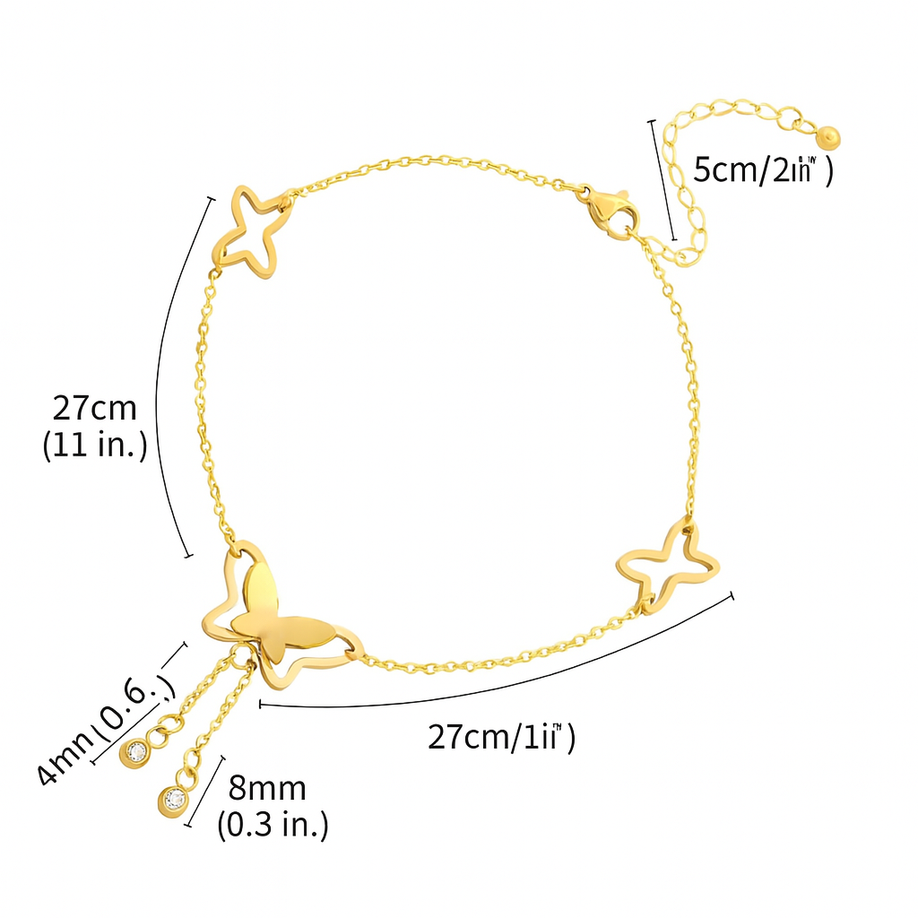 Step into elegance with this gold butterfly anklet – a charming blend of delicate detail and modern design. Featuring openwork butterfly charms and sparkling dangles, this ankle bracelet adds a touch of whimsy and shine to your everyday look.